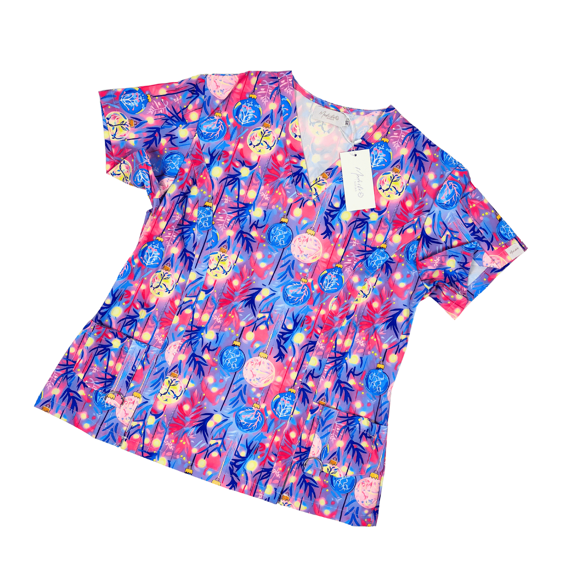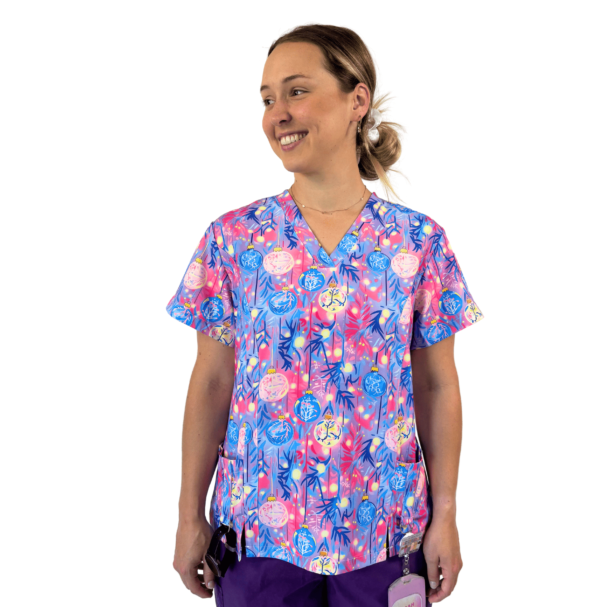 Ornamenta Scrub Top - Brighten up your holiday season with our dazzling Ornamenta scrub top! Adorned with vibrant purple, blue, and pink baubles, this festive design captures the joy and excitement of the holidays. Crafted from MedVibe’s signature 4-way stretch fabric, Ornamenta offers unmatched comfort and flexibility, making it perfect for those busy shifts. Whether you’re spreading cheer at work or celebrating the season with friends, this scrub top is sure to make a statement. Embrace the festive spirit and sparkle in Ornamenta—where style meets holiday magic!